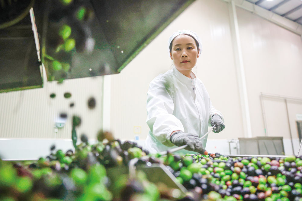 10月31日,正在陇南市武都区一家油橄榄加工企业,工做人员正在出产线上功课。 记者 陈斌 摄。